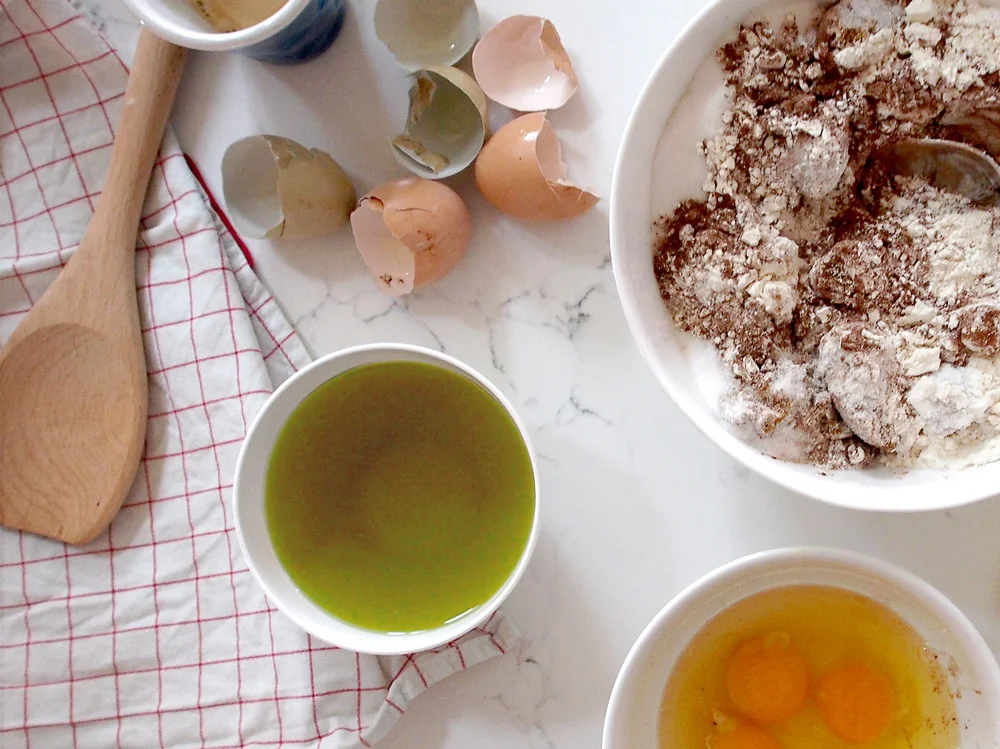 Combine all the dry ingredients in a bowl. Add the oil and espresso and beat until just combined. Whisk up the eggs, add them to the batter and beat until just incorporated. Beating them for this short amount of time will keep your brownies dense, moist and fudgy, whereas overbeating will make them more spongey, fluffy and cake-like. Stir through the roughly chopped almonds.
