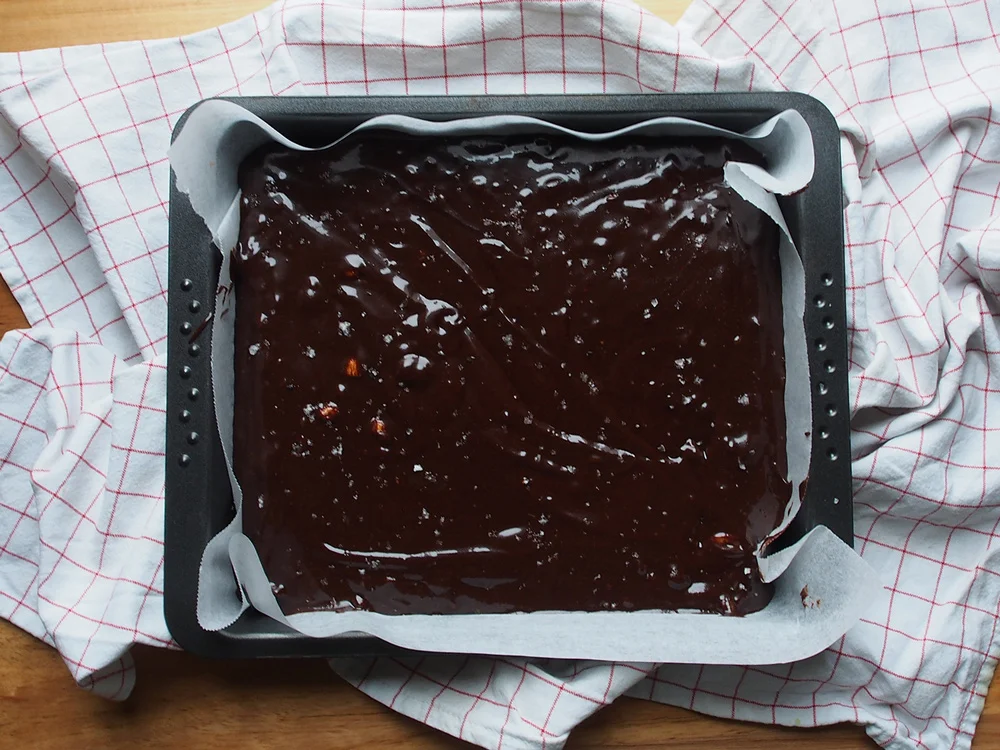 Spread the mixture evenly into the lined baking tin and sprinkle with sea salt.